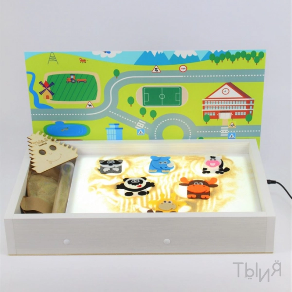 Световой-планшет, песок, подсветка, яркий корпус, отсек для инструментов и песка.