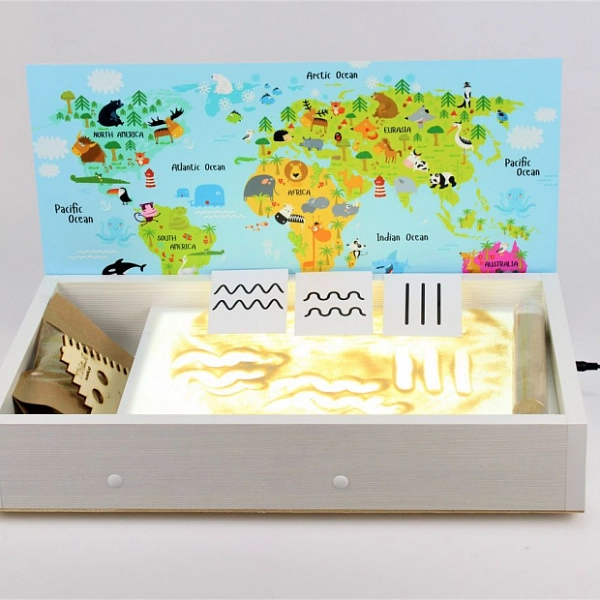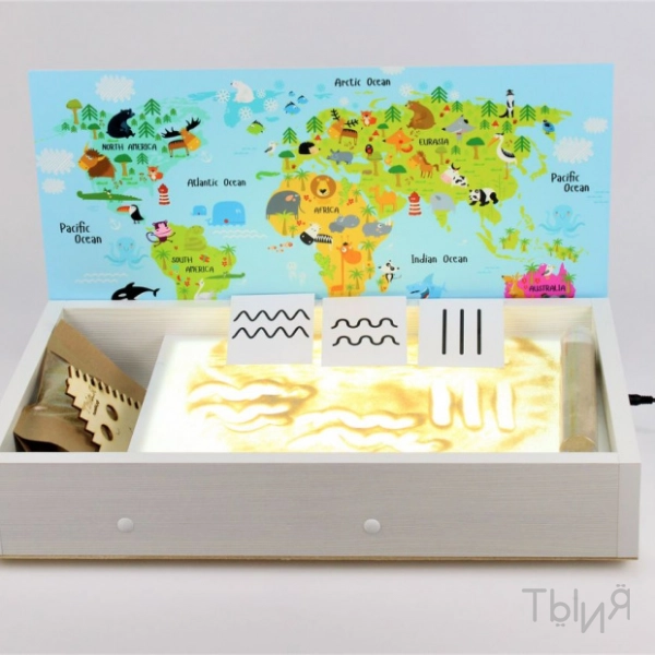 В комплекте: световой планшет, крышка, песок, подсветка, яркий корпус, отсек для инструментов и песка.