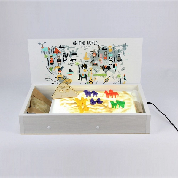 В комплекте: световой планшет, крышка, песок, подсветка, яркий корпус, отсек для инструментов и песка.